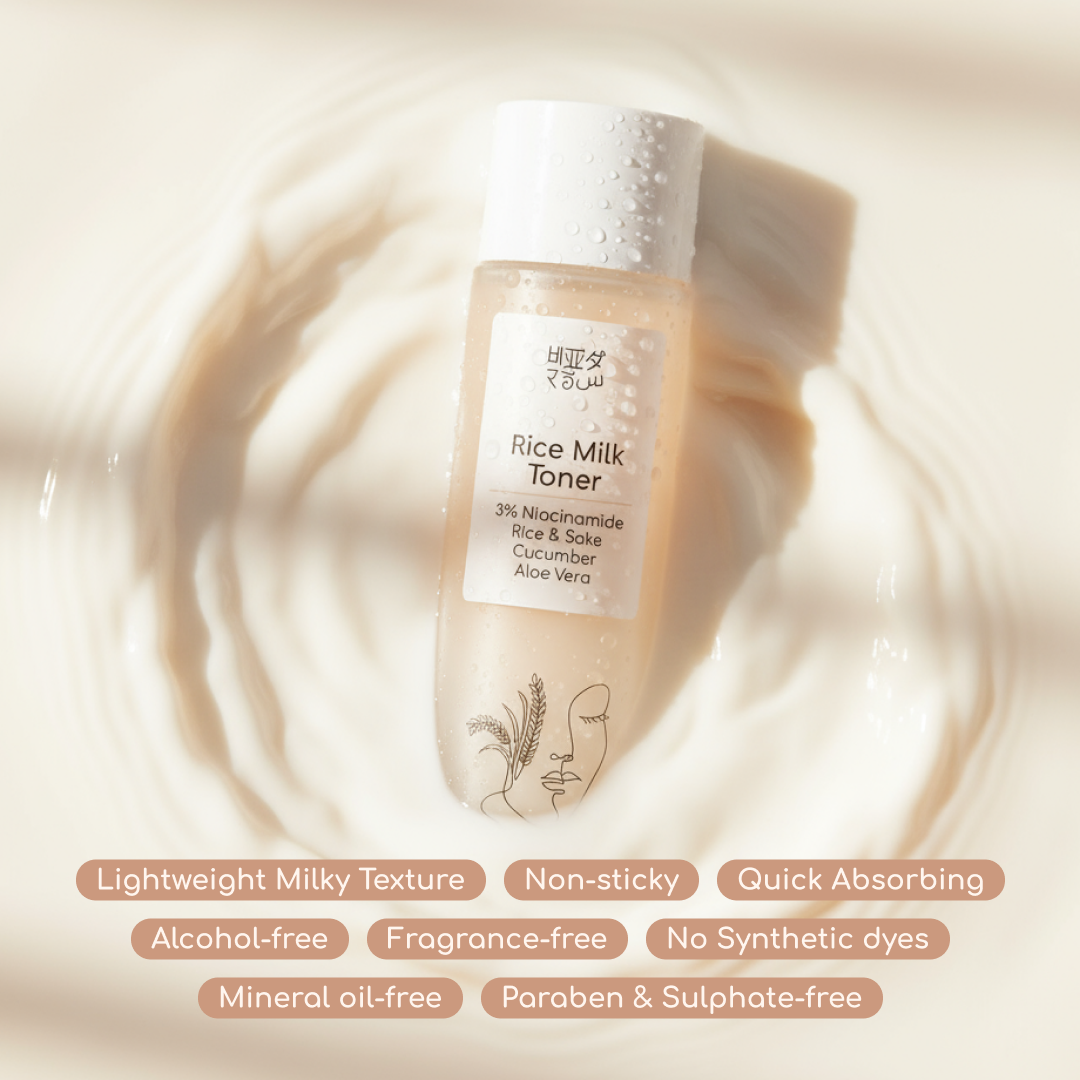 Rice Milk Toner with 2% Niacinamide and Rice & Sake is a lightweight, milky toner designed to soothe, hydrate, and brighten skin for both men and women. It delivers soothing and calming relief to irritated skin while providing deep hydration for a soft, plump feel. Niacinamide, Rice Lees Extract (Rice Sake), and Rice Ferment help brighten skin tone, support the skin barrier, and improve overall texture. Enriched with Cucumber and Aloe Vera, it is gentle enough for all skin types, including sensitive. The formula is non-sticky, quick absorbing, alcohol-free, fragrance-free, and contains no synthetic dyes, mineral oil, parabens, or sulphates. This toner is 100% vegan and cruelty free, making it a conscious choice for your daily skincare routine.
