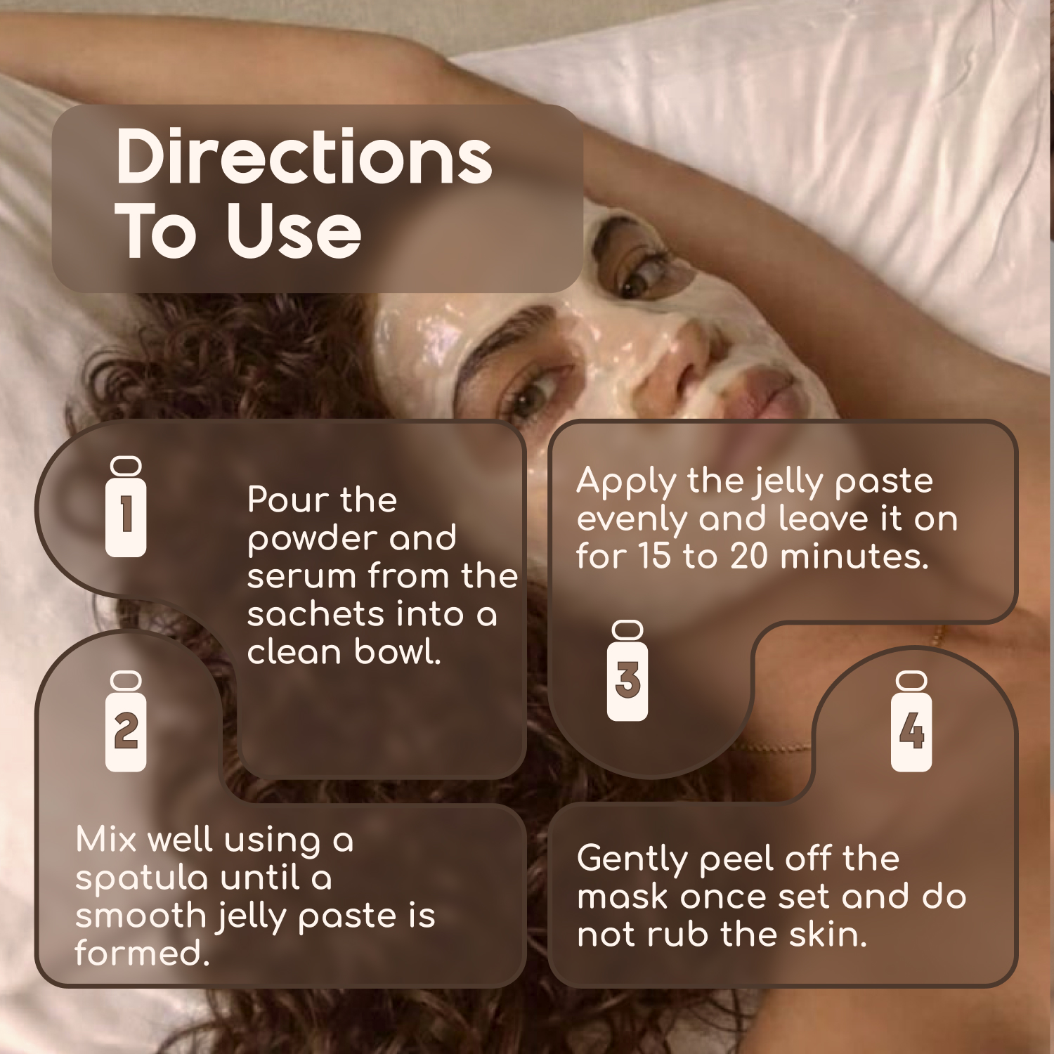 Mix 1 sachet powder with serum until smooth. Spread evenly on clean face, wait 20-25 mins until jelly sets, then peel off gently. Use 1-2x weekly for best results.